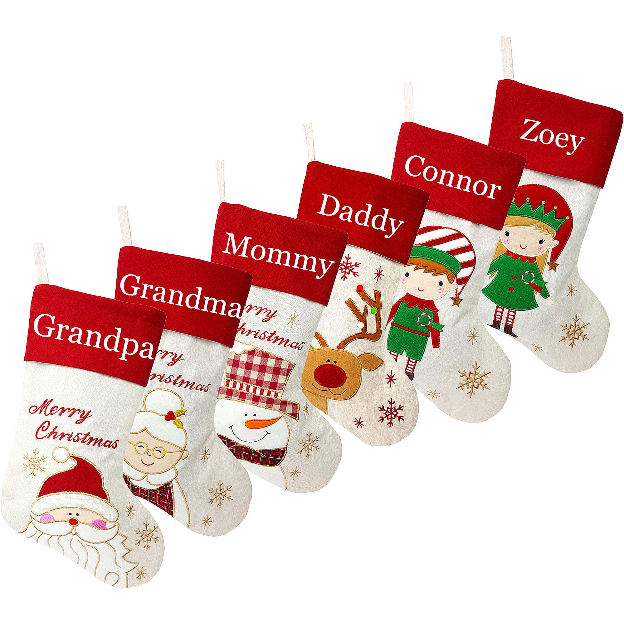 Amazon Com Dearsun Set Of 6 18 Personalized Christmas Stocking With Embroidered Names Santa Mrs Claus Snowman Reindeer Elf Boy Elf Girl Designs Quality Linen Stockings For Family Decor Home Kitchen